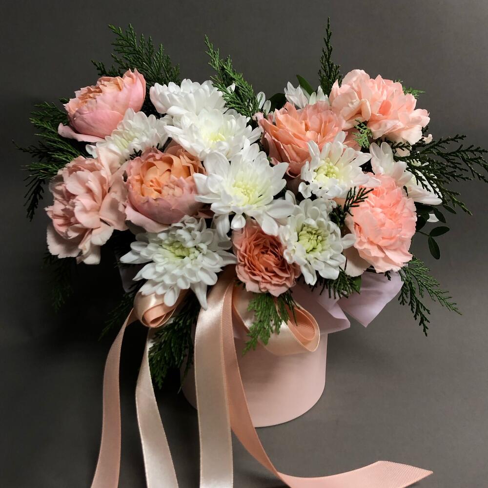 Нежный букет в коробке из свежих пионовидных персиковых роз сорта Джульетта и крупных диантусов. Яркая зелень туи добавляет букету зимний колорит 💐