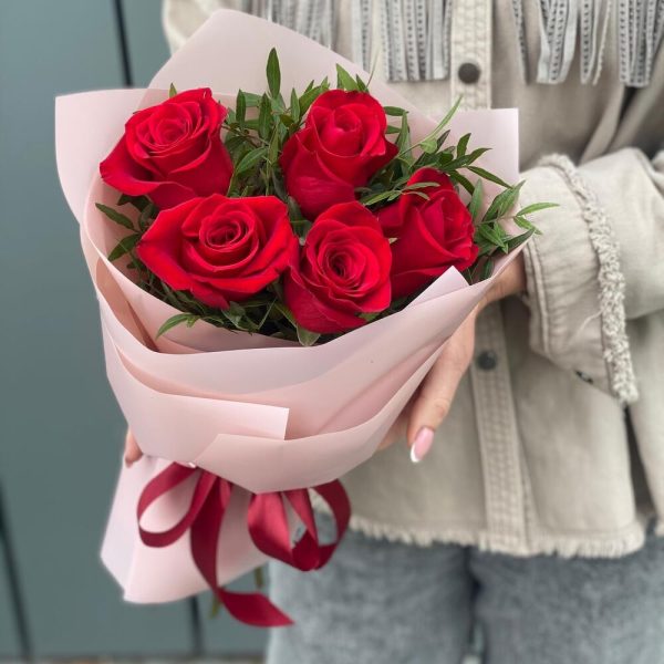 Букет из 5 красных роз и зелени в оформлении!