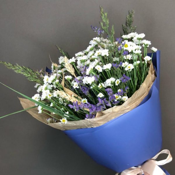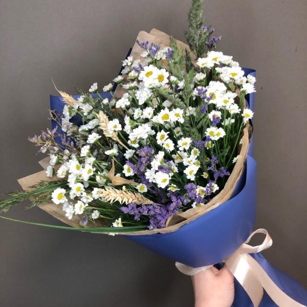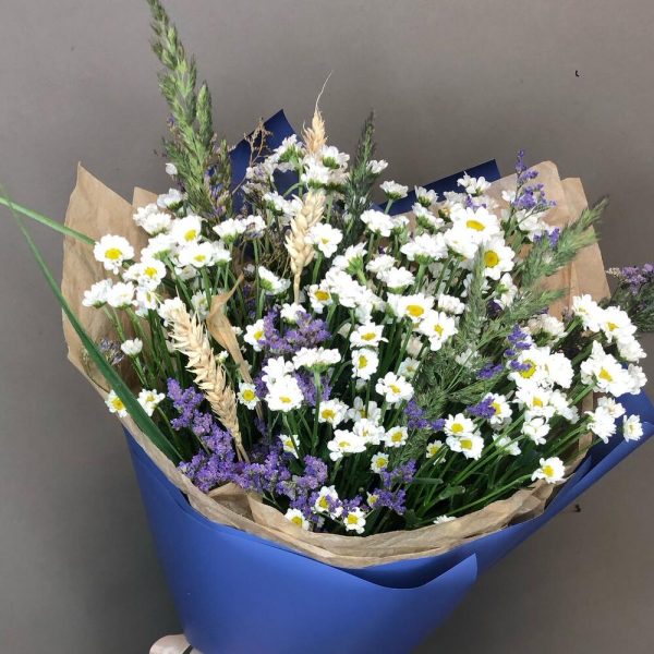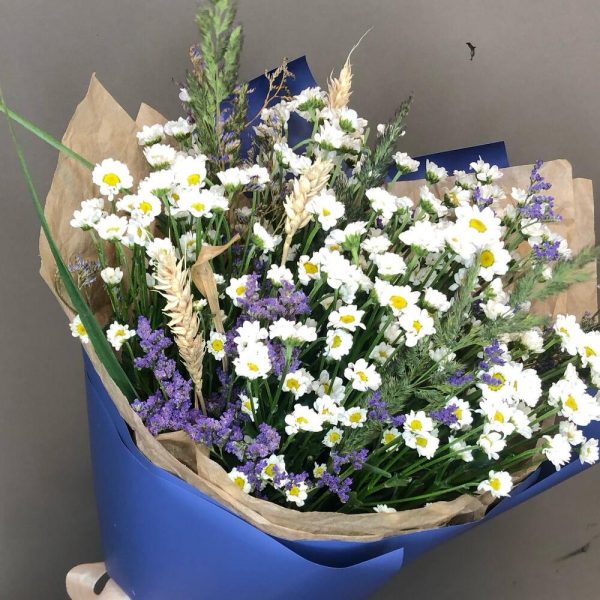 Стильный, нежный и трогательный. Свежий, как будто собран с утра в поле, чудесный букет из ромашек, лимониума и колосков пшеницы с сезонной зеленью порадует тех, кто устал от роз, хризантем и других «банальных букетов».